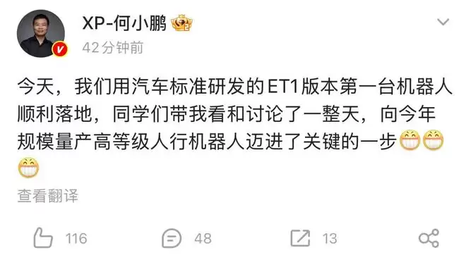 1月19日,小鹏汽车董事长何小鹏在其微博发文宣布,其采用汽车标准研发的ET1版本首台人形机器人顺利落地。这标志着公司朝着今年实现高端人形机器人规模化量产的目标,迈出了关键一步。