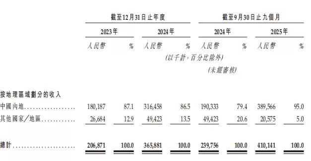 2023年至2025年前九个月,璞物智能的主要收入来自中国内地,分别为1.80亿元、3.16亿元及3.90亿元,占比分别为87.1%、86.5%及95%。