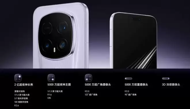 搭载2亿像素超夜神长焦、5000万像素超夜神主摄、5000万超广角镜头组合,还有自研AiMAGE原色引擎加持。