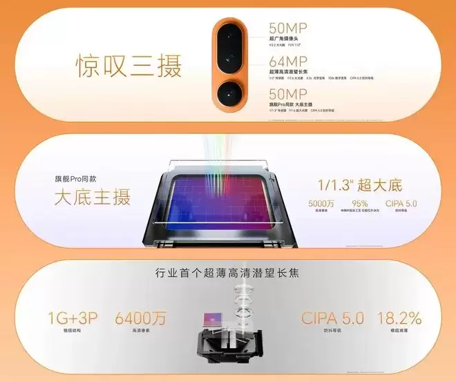 还有6400万像素超薄高清潜望长焦,同样具备CIPA 5.0级防抖,3.2倍光学变焦。5000万像素超广角,112°视角。