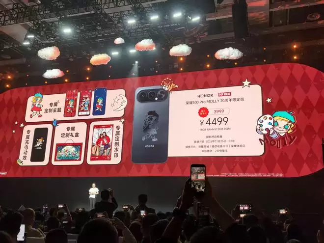 对了,这场发布会上荣耀还带来了荣耀500 Pro与泡泡玛特Molly的20周年联名款,仅曜石黑一个配色,随机附赠泡泡玛特Molly联名礼盒,内置Molly专属主题和个性水印。荣耀500 Pro泡泡玛特Molly联名款定价4499元,国补后价格为3999元。对于喜欢Molly角色的朋友,这款机型还是相当有趣的。