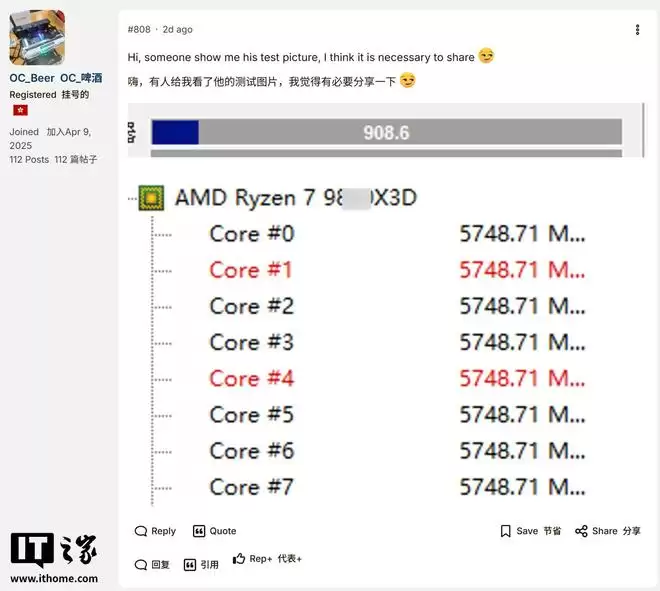 1月20日,IT之家报道称,超频爱好者OC_Beer于1月18日在Overclock论坛发布了一张CPU-Z截图,展示了尚未正式发布的AMD Ryzen 7 9850X3D处理器的超频实测结果。