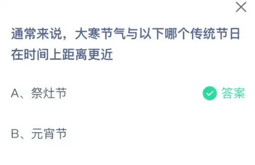 大寒这个节气,和哪个传统节日在时间上挨得更近呢?支付宝小鸡课堂今天开课啦!每天花上一分钟答题赚饲料,顺手喂喂小鸡就能献爱心,既轻松又有意义!根据2026年1月20日蚂蚁庄园的课堂题目,正确答案是【祭灶节】。没错,大寒和祭灶节在时间上最为接近。
