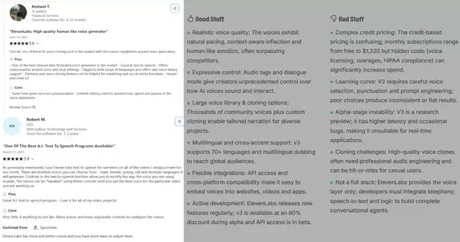 在Capterra评测平台上,来自金融服务行业的分析师Nishant T.称,ElevenLabs在文本转语音、语音生成和语音风格自定义方面优势明显,但语速、语调和停顿的精细化控制仍有提升空间。