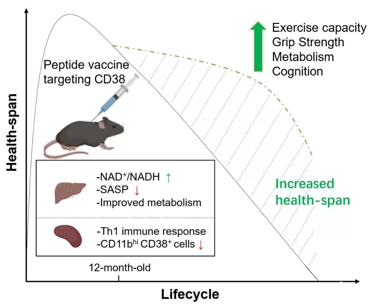靶向CD38的多靶疫苗改善小鼠衰老相关表型并有效提高小鼠的健康寿命。
