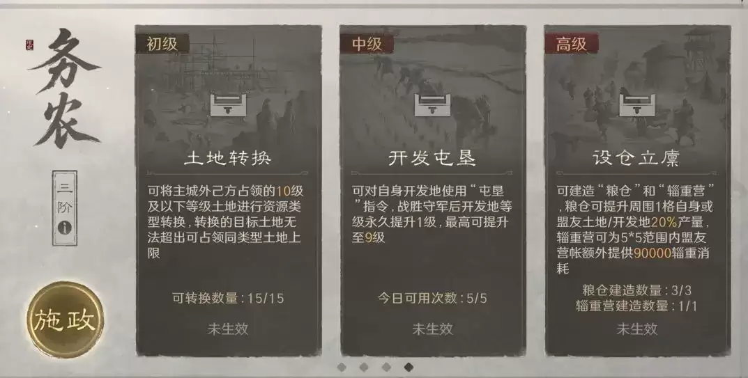 新赛季开启后,方略系统将自动解锁。系统共设四大基础方略类别:务农、机动、富国、戎机。所有方略的效果,都会随着赛季天数递增而逐步强化。方略的激活分为三个等级:初级方略可即时生效;中级方略需24小时准备;高级方略则需等待48小时。赛季初始,您只能激活一种方略。后续每完成一次中心州结算,您将额外获得一次重新选择方略的机会。整个赛季中,最多可并行激活三种不同类别的方略,且类别不可重复。各类方略独立计时、互不干扰。已选方略支持重置,但需要经历3天的冷却期。