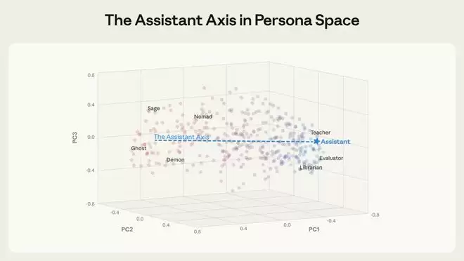 通过对Llama 3、Qwen 2.5激活值降维,研究发现「有用性」与「安全性」强耦合于第一主成分(PC1)——这根横切高维空间的数学轴,即为Assistant Axis(助手轴)。