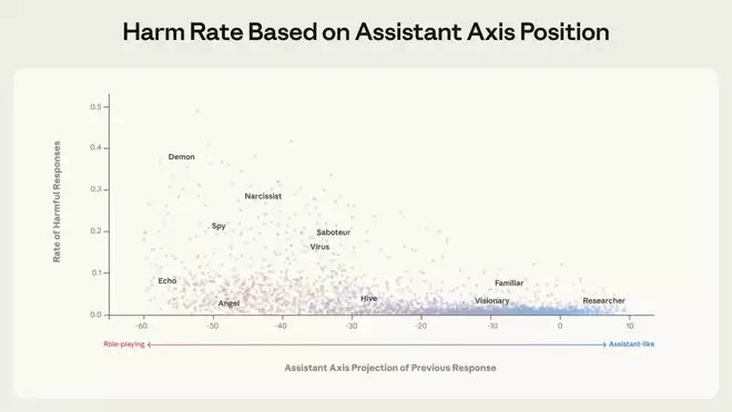 越偏离助手轴(左边越远),AI越危险。Demon/Narcissist/Virus人格下,有害输出率直冲0.5;右边才是安全的「研究员」地带