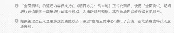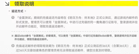 在“全面测试”期间产生的所有充值,都会在《明日方舟:终末地》正式公测后,通过游戏内邮件的形式发放给玩家。各位管理员需要使用在“全面测试”中进行充值操作的同一鹰角通行证账号登录游戏,并在开启邮件功能后,即可查收并领取相应的充值返还邮件。