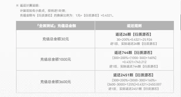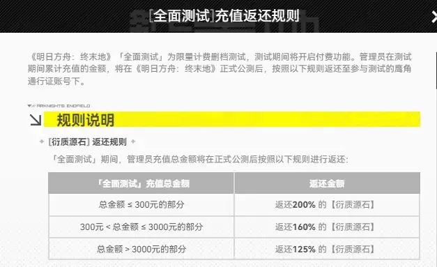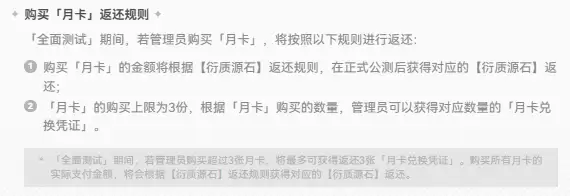 1. 在“全面测试”期间,若玩家购买超过3张月卡,最多可额外获得3张“月卡兑换凭证”作为返还。购买所有月卡的实际支付总金额,将根据【衍生源石】的返还规则,兑换为对应数量的【衍生源石】进行返还。