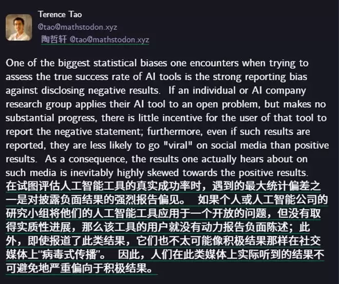 更重要的是,就在讨论声愈发热烈的当天,陶哲轩还在发帖提醒公众需要警惕“报告偏差”(reporting bias)。他在 Mathsodon 上写道:“当研究者用 AI 尝试解题却失败时,几乎不会公开结果;而成功案例则极易在社交媒体病毒式传播。因此,我们看到的‘AI 连续攻克难题’印象,严重偏向正面。”