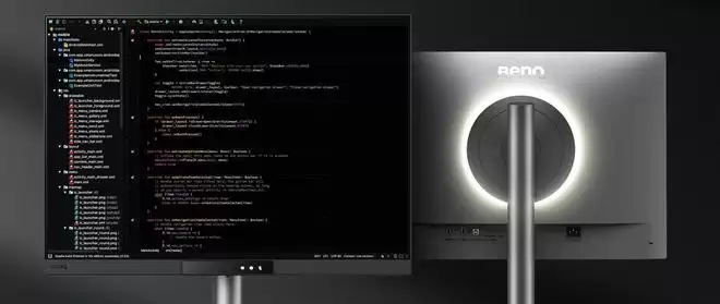 作为一款专为编程设计的显示器,RD280UG不仅提供了更多的显示行数,更内置了多项针对编程工作的优化功能:其面板覆盖了抗反射涂层,背部具备MoonHalo自适应灯环系统。设备支持浅色/深色编程专业色彩模式、彩纸模式以及猫头鹰(深夜)模式,显示效果可根据昼夜环境实时调节,让代码阅读更加舒适。此外,它还配备了专属的编码模式切换按键,在双信号输入时,可在不同区域应用不同的色彩模式。
