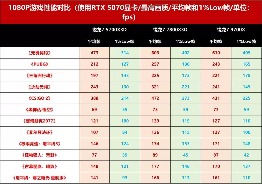 锐龙7 9700X虽无3D V-Cache,但依托Zen5架构与5.5GHz高频,在12款游戏中有11款超越5700X3D,仅在《永劫无间》中以2帧微弱落后。它在《无畏契约》《极限竞速:地平线5》《艾尔登法环》等游戏场景中平均帧率甚至逼近7800X3D,且其TDP仅为65W,在拥有较低功耗的同时,游戏性能方面也有一战之力。