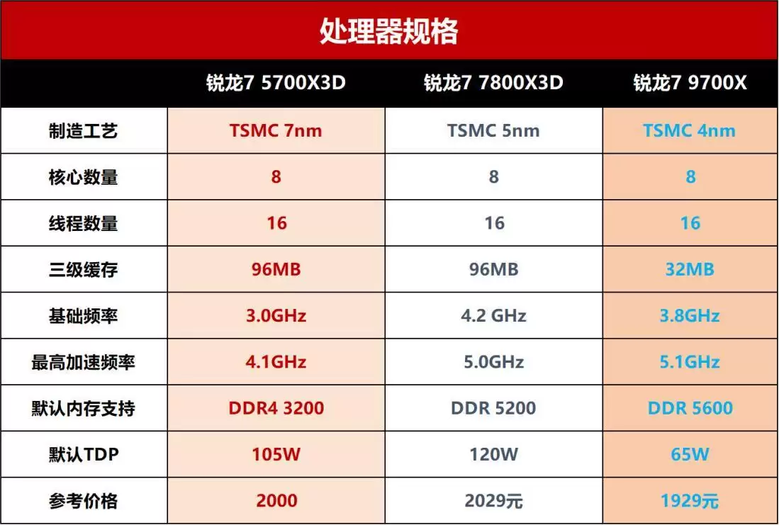 然而,9700X凭借更先进的Zen5架构与高达5.5GHz的加速频率,不仅单核性能大幅提升,功耗反而更低(TDP仅为65W),对散热的要求也显著降低;而7800X3D则在继承Zen4架构的基础上,同样拥有96MB 3D V-Cache,并支持AM5平台的DDR5与PCIe5.0,在游戏场景中往往比9700X更具帧率优势。