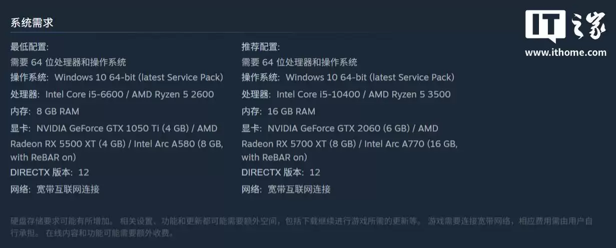英特尔酷睿 i5-10400 / AMD锐龙5 3500内存8GB16GB显卡英伟达GTX 1050 Ti(4GB)/ AMD Radeon RX 5500 XT(4GB)/英特尔Arc A580(4GB,需开启ReBAR)
