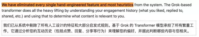 系统完全依赖Grok Transformer从用户互动序列中学习相关性,不做任何手工特征设计。