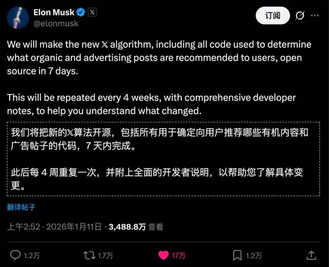 1月11日,马斯克在X平台上发了一条帖子,宣布将在7天内开源X平台全新的推荐算法。
