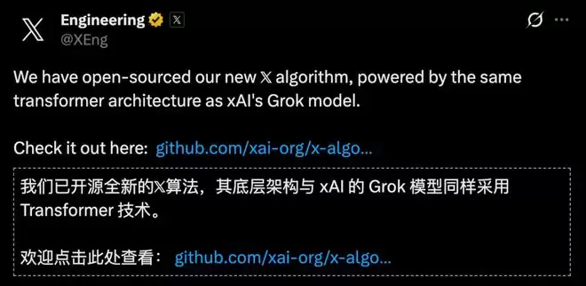 X平台工程团队(@XEng)今天正式宣布:全新的X算法已经开源。