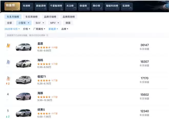 跳出北汽体系,极狐T1的销量也十分有竞争力。从汽车之家的销量榜来看,2025年12月,极狐T1的月销量超越比亚迪海豚,成为新能源小型车第三名,仅次于吉利星愿和比亚迪海鸥。