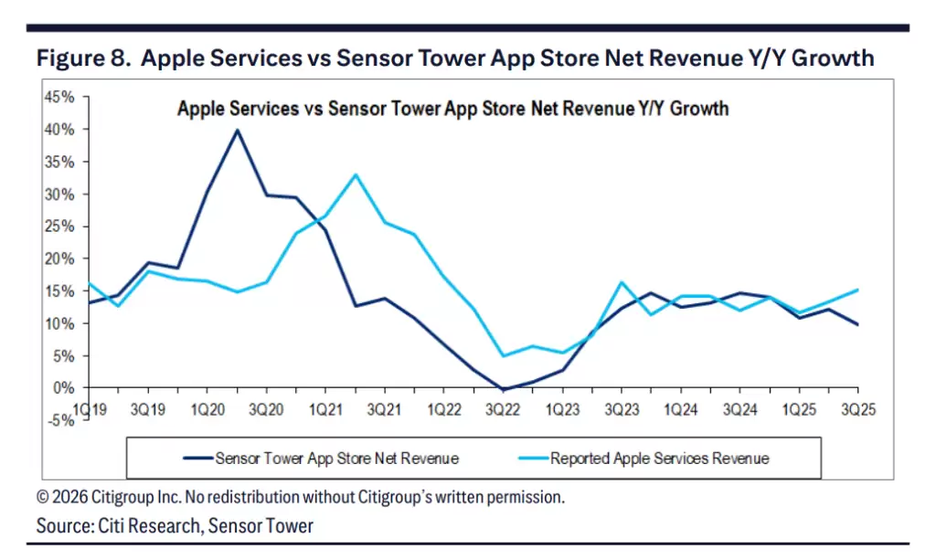Sensor Tower最新数据显示,苹果在12月季度的App Store收入同比增长7%,低于公司此前提出的服务总收入约14%的增长指引。值得注意的是,近几个季度以来,Sensor Tower统计的App Store收入增速与苹果整体服务收入增长之间已出现趋势性偏离。