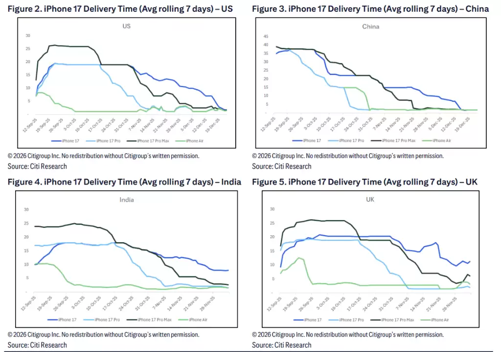 花旗研究报告指出,与其内部研究创新实验室的合作分析显示,iPhone 17的需求在2025年末持续保持强劲,预计将在3月季度呈现正常的季节性回调。根据该行模型,苹果在12月季度和3月季度的iPhone出货量预计分别为8200万部与5600万部,同比分别增长45%和下降32%,优于市场预期的41%增长与34%下降。