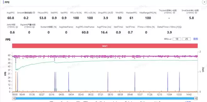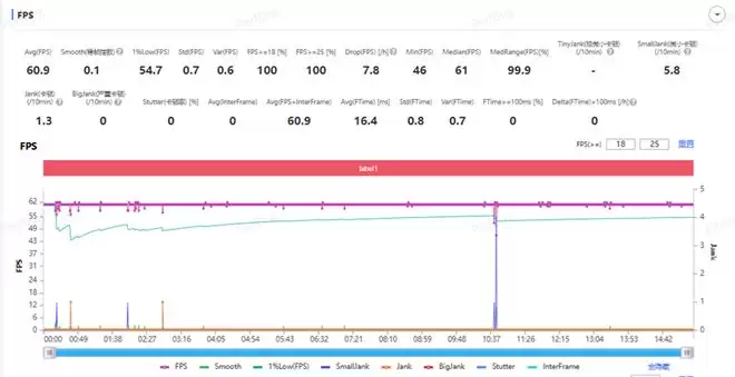 这次在红魔11 Air上的表现也不意外,游戏平均帧数为60.0FPS,稳帧指数0.1。1%low帧达到了54.7FPS。游戏甚至比王者荣耀更稳。
