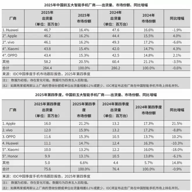 2025年手机市场战报出炉:华为全年第一,小米位居第四