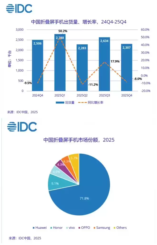 据悉,第四季度折叠屏出货量231万台,同比下降8%,虽然全年出货量勉强突破了1000万台大关(同比增长9.2%),但增速明显放缓,这标志着折叠屏已经进入了平台期。