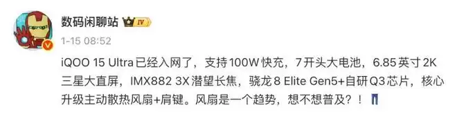 同一位博主此前还曾爆料称,iQOO 15 Ultra确升级主动散热风扇+肩键,有一套全新未来科技感设计,行业首个性能Ultra。