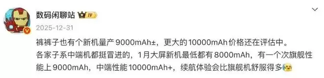 各家子系中端机都挺冒进的,1月大屏新机最低都有8000mAh,有一个次旗舰性能上9000mAh,中端性能10000mAh+,续航体验会比旗舰机舒服得多。