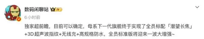 博主@数码闲聊站 的一份消息中提到,“独家超前瞻,目前可以确定,母系下一代旗舰终于实现了全员标配「潜望长焦」+3D超声波指纹+无线充+高规格防水,全员标准版将迎来一波大增强~”