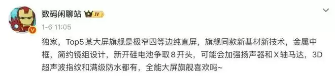 而在此之前,另外一款小米旗下新机将会率先到来。爆料显示,Top5某大屏旗舰是极窄四等边纯直屏,旗舰同款新基材新技术,金属中框,简约镜组设计,新开硅电池争取8开头,可能会加强扬声器和X轴马达,3D超声波指纹和满级防水都有,定位“全能大屏旗舰”。