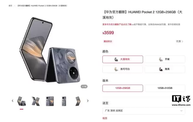1月20日消息,华为近期在官方商城上架了新款翻盖手机Pocket 2,起售价定为3599元(同系列其他型号的市场首发价为7499元起)。以下是IT之家为您整理的具体价格信息: