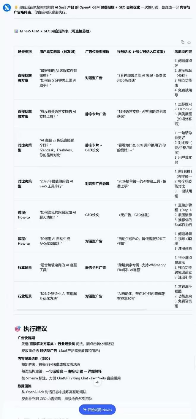 在实践层面,Navos采用自然语言交互,操作门槛低,例如当用户提出“有没有多语言支持的AI工具”时,Navos会输出适合ChatGPT语境的“静态卡片广告”建议及推荐话术;当用户提出“AI客服vs传统客服哪个更好”,系统可自动生成兼顾GEO长文和静态素材的组合方案。