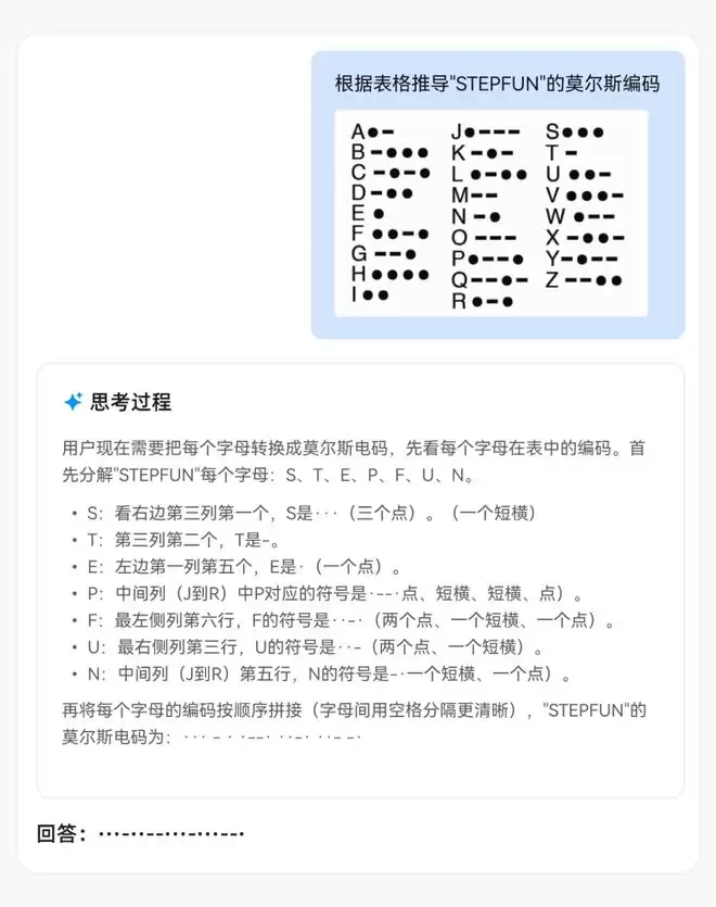 首先是关于摩尔斯编码的推理,可以看到模型的思考过程思路清晰,先拆解字母再逐个查表,最后拼接,流程正确,并且对大部分字母如S、T、E、F、U、N的定位和编码描述准确。
