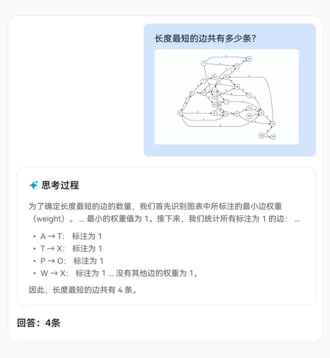 第三个是关于图推理的案例,模型需要在连线非常复杂的图片中准确识别中长度最短的图有几条,从思考过程可以看到,其先确认了最小权重的边长度是1,然后再统计所有权重为1的边。