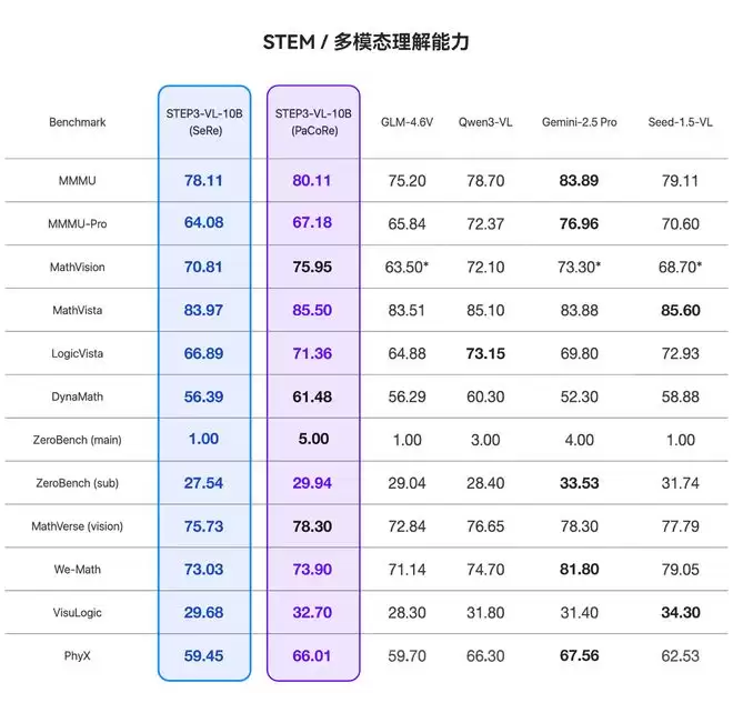 具体来看,在多模态推理能力上,Step3-VL-10B在部分测试集上超越了GLM-4.6V、Qwen3-VL等模型,其性能优于10倍至20倍大的模型。