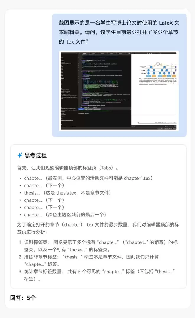 其次是GUI感知能力,模型需要识别标签页中以章节开头.tex结尾的文件标签,可以看到其思考过程采用了识别标签、排除非目标、统计数量的步骤进行了准确分析,并有效规避了干扰选项。
