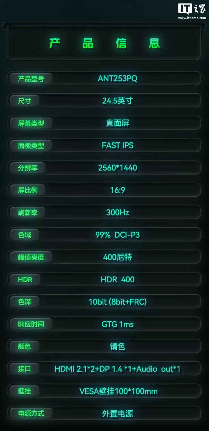 蚂蚁电竞24.5英寸ANT253PQ显示器上市:2K 300Hz售1799元