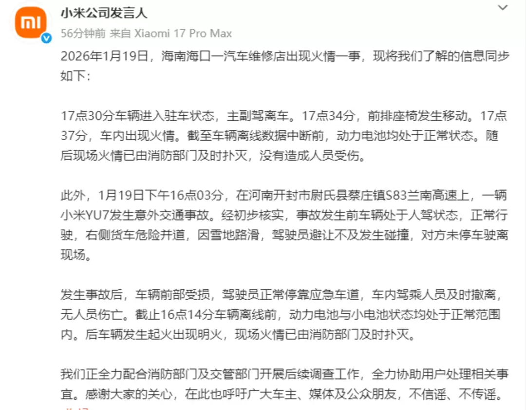 小米公司近日通报了两起涉及旗下车辆的突发事故。1月19日,海南海口一家汽车维修店内发生一起车辆火情。据通报,涉事车辆于当日17时30分进入驻车状态,主副驾驶人员均已离车。四分钟后,车辆前排座椅出现异常移动,七分钟后车内突然起火。监控数据显示,在车辆离线前,其动力电池始终处于正常工作状态。消防部门接警后迅速抵达现场,成功将火势扑灭,未造成任何人员伤亡。
