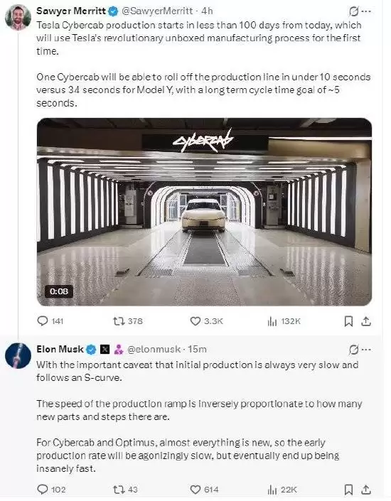 针对这一消息,特斯拉首席执行官马斯克做出了回应。他指出,在初始生产阶段,速度通常会比较缓慢,产能提升会遵循“S”型曲线的发展规律。产能爬坡的速度与新增零部件和工序的数量密切相关,两者呈反比关系。对于Cybercab和特斯拉人形机器人擎天柱而言,几乎所有零部件和制造工序都是全新的,这意味着早期生产速度会极为缓慢。不过,马斯克也强调,随着生产流程的逐步优化和熟练,最终将实现惊人的生产速度。