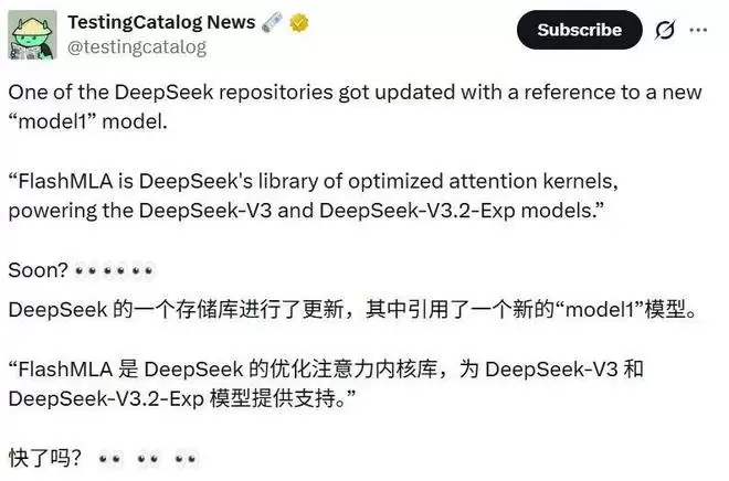 这些天,DeepSeek 给其 FlashMLA 代码库推送了不少更新,而在这些更新中,一个名为Model1的模型引起了广大网友的注意。