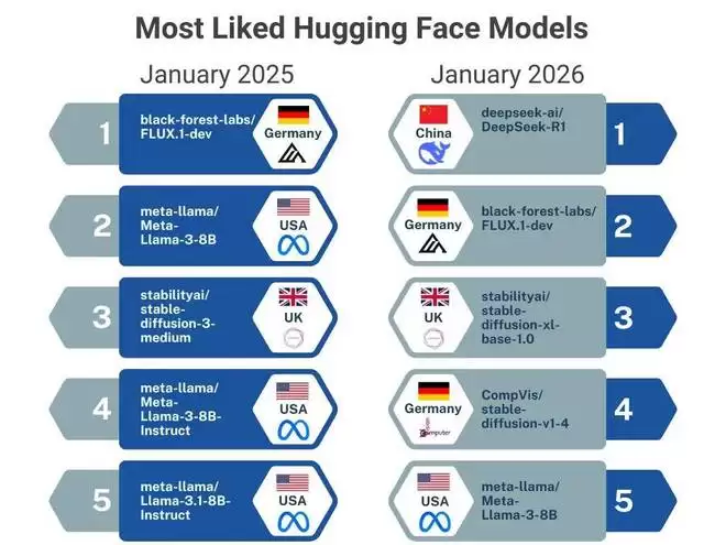 2025 年 1 月 20 日,DeepSeek(深度求索)正式发布了 DeepSeek-R1 模型,并由此开启了新的开源 LLM 时代。在 Hugging Face 刚刚发布的《「DeepSeek 时刻」一周年记》博客中,DeepSeek-R1 也是该平台上获赞最多的模型。