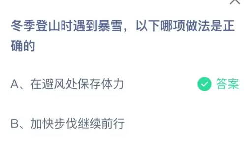 冬季登山途中突遇暴风雪,以下哪种应对方式才是正确的?支付宝小鸡课堂开课了!每天花一分钟参与答题,就有机会赢取饲料,喂养小鸡还能顺便奉献爱心!轻松又有意义!2026年1月21日蚂蚁庄园的小鸡课堂题目正确答案是【在避风处保存体力】,冬季登山时遭遇暴风雪,选择在避风处保存体力是正确的做法。