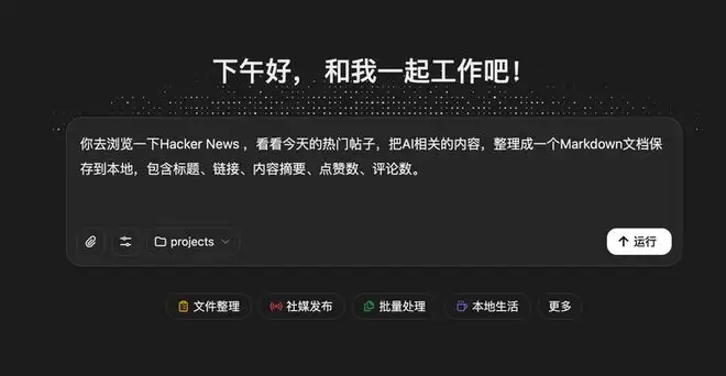 打开桌面端,输入 Prompt:“你去浏览一下 Hacker News,看看今天的热门帖子,把 AI 相关的内容整理成一个 Markdown 文档保存到本地,包含标题、链接、内容摘要、点赞数、评论数。”