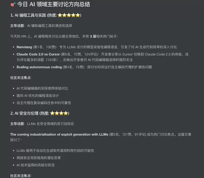 但我还想继续加码,“把刚才整理的内容按热度排序,用表格形式呈现,另外帮我总结一下今天 HN 上 AI 领域的主要讨论方向。”