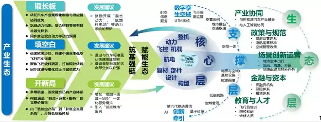 · 赋能生态:以核心层的航空级自主可控能力为基础,向外延伸补强支撑层的政策、空域、数字与基础设施保障能力,并在生态层逐步形成适航、空管、运营与服务协同运行的完整产业生态。