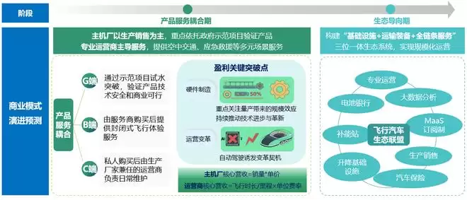 关键判断六:飞行汽车商业模式将沿“耦合产品服务→闭环生态”两阶段演化,最终通过共享运营和平台化服务,构建可持续的立体出行价值网络。