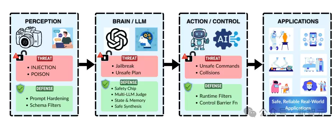 这项最新研究首次系统性地探讨了大型语言模型控制机器人时面临的安全威胁、防御机制与未来挑战,并指出LLM在物理世界中的“具身鸿沟”可能导致其执行危险操作,而现有防护体系存在逻辑与物理层面的脱节等问题。