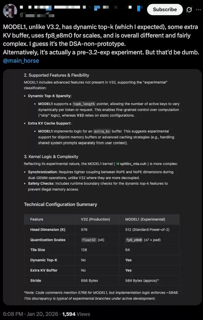 一位海外网友也对这部分代码进行了深入解读,他认为,MODEL1在整体结构上展现出更强的实验性特征,支持动态Top-K稀疏推理逻辑,还引入了额外的KV缓存区。